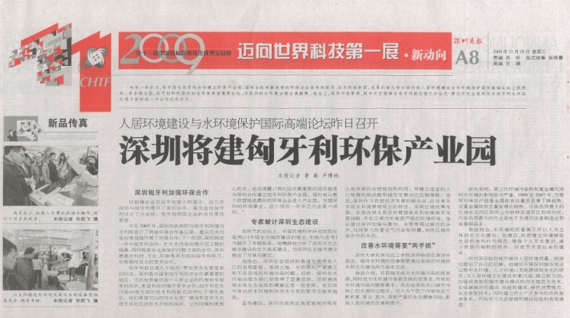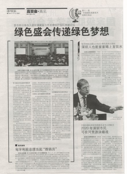 2009年11月18日上午,人居環(huán)境建設(shè)與水環(huán)境保護(hù)國際高端論壇在深圳五洲賓館召開,我中心中水工程有限公司匈方高級顧問、匈牙利AQUAPROFIT公司高級經(jīng)理、阿提拉?高喬戈先生和我中心奧尼卡合資公司匈方總顧問、匈牙利ORGANICA生態(tài)技術(shù)股份有限公司總裁、伊斯特萬?凱涅來西先生分別在論壇上發(fā)言。