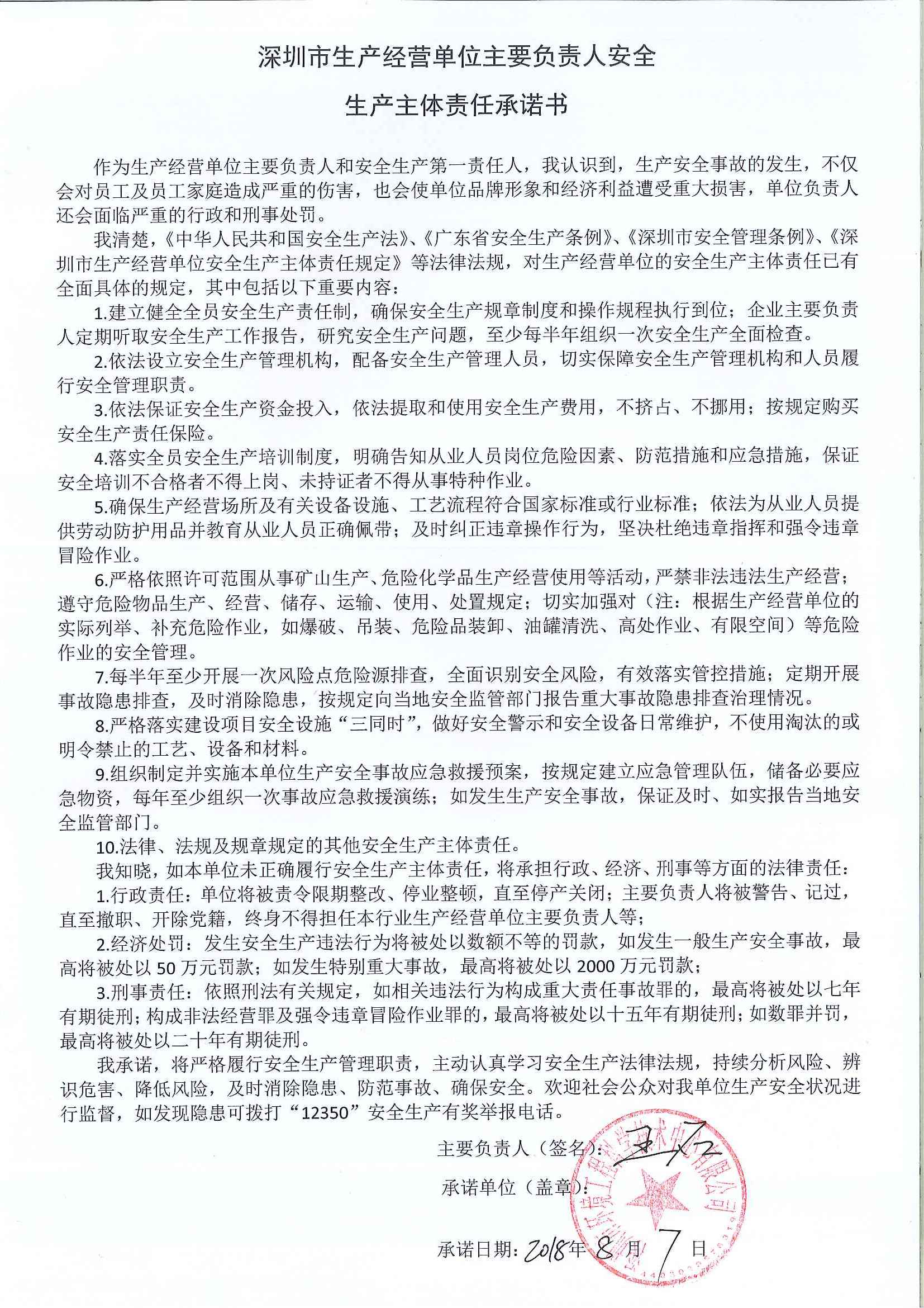 深圳市生產(chǎn)經(jīng)營單位主要負責人安全生產(chǎn)主體責任承諾書
